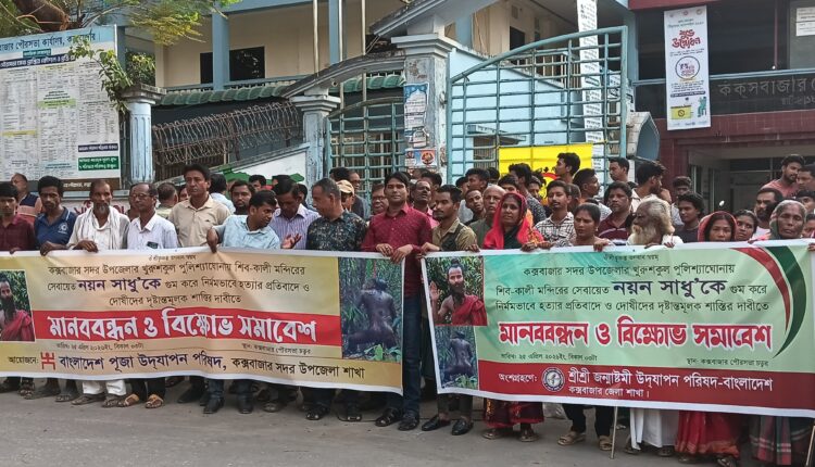 কক্সবাজার সদর উপজেলার খুরুশকুল পুলিশ্যাঘোনা এলাকার শিব কালী মন্দিরের সেবায়েত নয়ন সাধুকে নৃশংসভাবে খুনের প্রতিবাদে বিক্ষোভ সমাবেশ, মানববন্ধন ও মিছিল হয়েছে।